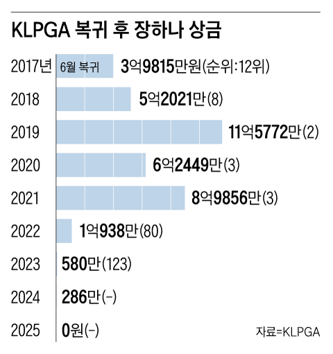 Because of years of underperformance, Jang Hana does not have a spot for next year's main tour. Recently, the KLPGA provided "special spots" to certain players who either played in the main tour for 10 straight years or accumulated prize money exceeding 2.5 billion Korean won. Despite having 15 career victories and about 5.8 billion Korean won in total earnings, Jang Hana was not included. It is believed that her time on the U.S. tour made it difficult for her to meet the "10 consecutive years" requirement. She stated, "It's disappointing, but I'm not upset. I'll take this as new motivation." To compete locally, she needs to take part in the second-tier tour qualification in March next year. However, she did not talk about specific plans. A representative from her agency mentioned, "She has received invitations from overseas tours, but she needs some time to think things through first."